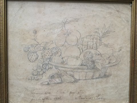 Andreas Fiebig (19 årh): Skål med frugter og nødder 1856. Bly på papir. Under tegning er der skrevet med pen - "Til min kjære Onkel - Juuleaften 1856 - Fra din Andreas Fiebig" 16x19 (18x21)