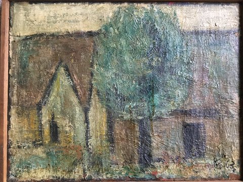Victor Kvedéris (1909-66): Huse og træ 1963. Olie på lærred. Sign.: KV (monogram). Dateret 1963. Lidt snavset. 46x59 (49x62)