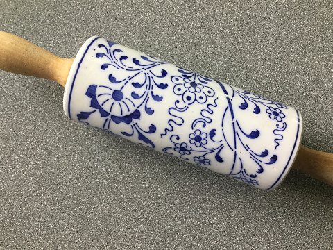 Løgmønsteret (Tyskland): Gammel kagerulle med drejede træhåndtag. Tyskland ca. 1880-1900. Uden stempel. Fajancerullen måler i længden 19 cm og hele rullen måler 40 cm.