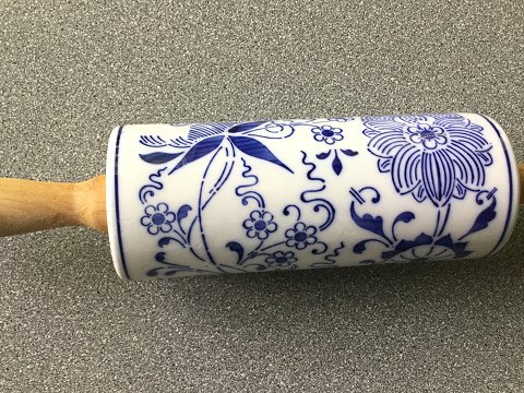Løgmønsteret (Tyskland): Gammel kagerulle med drejede træhåndtag. Tyskland ca. 1880-1900. Uden stempel. Fajancerullen måler i længden 19 cm og hele rullen måler 40 cm.