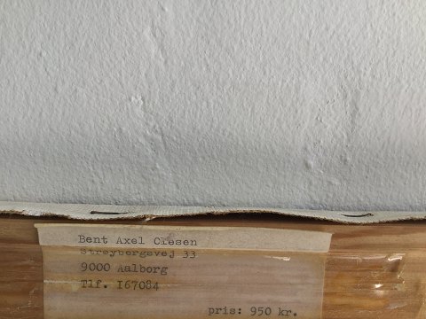 Bent Axel Oelsen (født 1941): Huse ved solnedgang 1977. Olie på lærred. Sign.: Bent Ax. Olesen Bagpå - Bent Ax. Olesen - Nov. 1977. Uden ramme. 54x65 Bent Axel Olesen er elev af Aage Sørensen 1976-81.