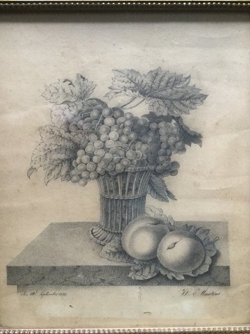 W.E. Martini (19 årh): Opstilling på stenkarm med ferskner og kurv med druer og vingrene 1855. Bly på papir. Sign.: W.E. Martini. Dateret den 29' september 1855. 25x21 (30x26)