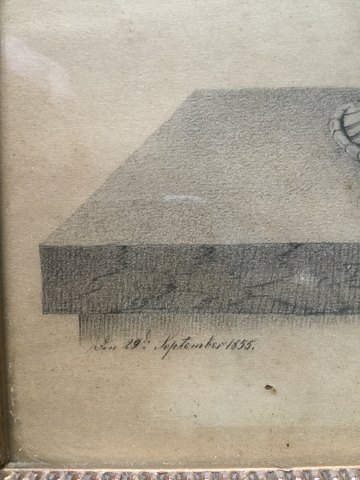 Opstilling på stenkarm med ferskner og kurv med druer og vingrene 1855.