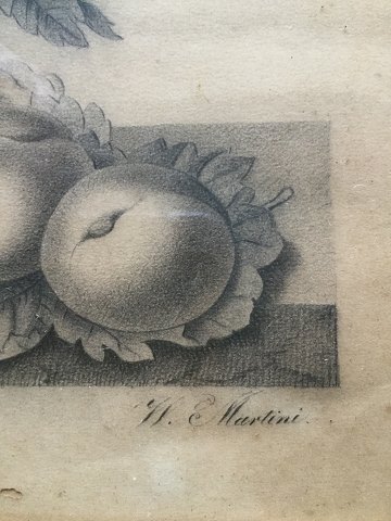 W.E. Martini (19 årh): Opstilling på stenkarm med ferskner og kurv med druer og vingrene 1855. Bly på papir. Sign.: W.E. Martini. Dateret den 29' september 1855. 25x21 (30x26)