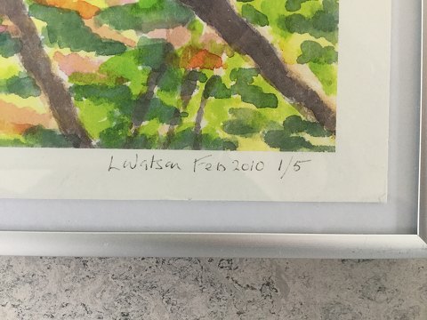 Linda Watson (20 årh): Litografier på papir. Begge signeret - L. Watson Febr. 2010. Litografi 1: Titel - Trees by Lake" Litografi 2: Titel - "Shaded walk" Begge 26x33 (29x36)