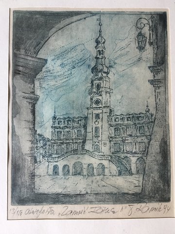 Ubekendt kunstner (20 årh): Hovedtorvet i den polske by Zamocz med Rådhuset 1994. Radering på papir. Nummer 13/150 Betegnet - Rataus Zamosc Sign.: Utydelig signeret - 94. 16x12 (26x22)