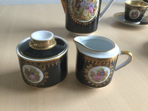 Rieber, Bavaria Mokkastel: Transfer dekoreret med rococoscener i cartouche. Fond i Royal Blue og med bred guld fane. Kande, sukker/fløde sæt og 4 par kopper.