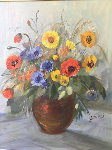 Ingeborg Bentine Debois (1897-1970): Krukke med kornblomster, valmuer m.fl. Olie på lærred. Sign.: I.B. Debois 49x39 (60x50)