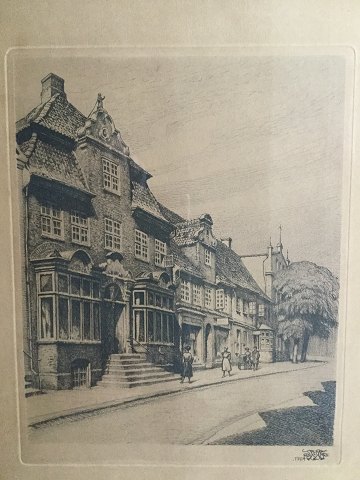 Peter Tom-Petersen (1861-1926): Digegrevens Hus i Tønder 1924. Radering på papir. Sign.: Monogram 1924 Indrammet i smuk guldramme. 32x25 (47x40)