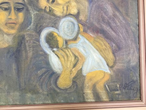Kristine Høeg (1907-90): Familie Kærlighed. Olie på lærred. Sign.: K. Høeg. Bagpå betegnet - Familie Kærlighed. 67x118 (79x130)