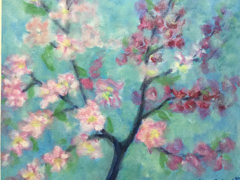 Jens Bilgram (1937-2013): Blomstrende æblegrene 1990. Akryl på plade. Sign.: Jens Bilgram - 90. Bagpå - Æbleblomstring Maj 1990 - Jens Bilgram. Indrammet - 37x42