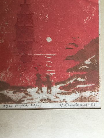 Bertil Landelius (1912-85): 2 personer og sejlskib ved solnedgang. Farvetræsnit på papir. Eget tryk no. 20/30 Sign.: B. Landelius Utydelig dateret. 13x9 (24x18)