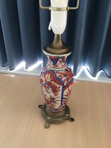 Gammel japanske vase omlavet til lampe. Polykrom bemalet antik porcelæns vase fra Japan. Monteret i nyere tid med messing firepas fod og top. Højde excl. fatning - 29 cm.