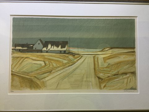 Erik Nørgaard (1920-97): Nordjysk landskab med gård, vinter. Farvelitografi på papir. Nummer - 53/70 Sign.: Erik Nørgård (bly) Indrammet i aluramme med lækker passepartout. 39x65 (54x78)