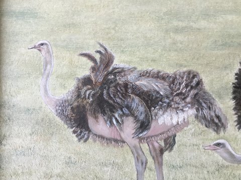 Hugo Møller Knudsen (født 1949): 2 Strudse i Aalborg Zoologiske Have. Olie på plade Sign.: HMK (monogram) Bagpå - "Struds: Aalborg Zoo- H. Møller Knudsen" 38x46 (40x48)