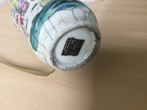 Porcelæn med kracelé glasur og polykrom dekoration i form af personer i landskab.