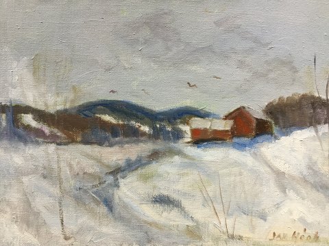 Jan Høgh (født 1957): Vinterlandskab 1992. Olie på lærred. Sign.: Jan Høgh Bagpå - Jan Høgh "Vinter" 1992. 33x46 (35x48)