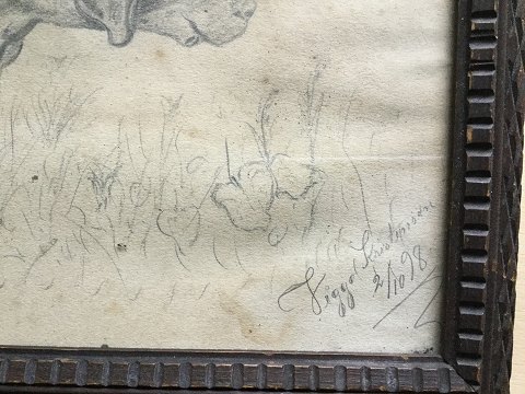 Viggo Kristensen (19 årh): Jagthund 1898. Bly på papir. Sign.: Viggo Kristensen 2/10 98. Flere små fugtpletter. Indrammet samtidig i smuk karvesnitramme. 20x37 (22x39)