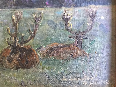 Hvilende kronhjorte ved skov 1925.