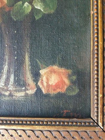 C.F. Madsen (død 1929): Lyserøde roser i vase. Olie på lærred monteret på pap. Smuk samtidig guldramme med "Løbende hund" frise. Sign.: CFM 20x14½ (23½x18)