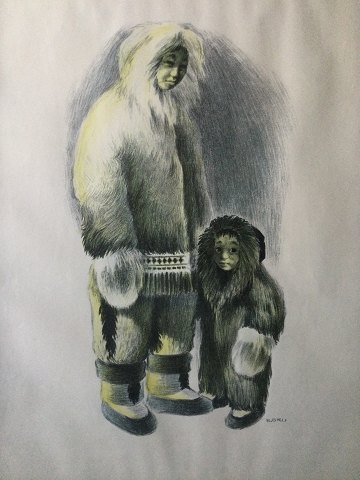 B. Gru (20 årh): 2 Grønlændere i sælskindsdragter. Litografisk tryk på papir. Sign.: B. Gru Indrammet 49x39