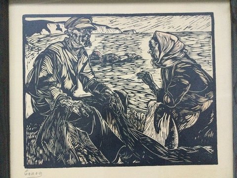 Svend Mussmann (20 årh): Fisker og fiskerkone bøder garn. Træsnit på papir. Sign.: Usigneret Betegnet - Conog Indrammet - 46x54