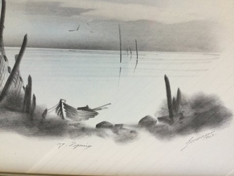 Elsius Johansen (20 årh): Kystparti med både 1963. Bly/kul på papir. Sign.: Johansen 1963 Indrammet 48x57