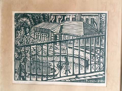 Bent Høyrup (født 1915): Mor med barnevogn. Træsnit på papir. Signeret i trykket 1965-BH. Signeret med bly Bent Høyrup. Betegnet - "Gade op og Gade ned" 28x35 (42x49)