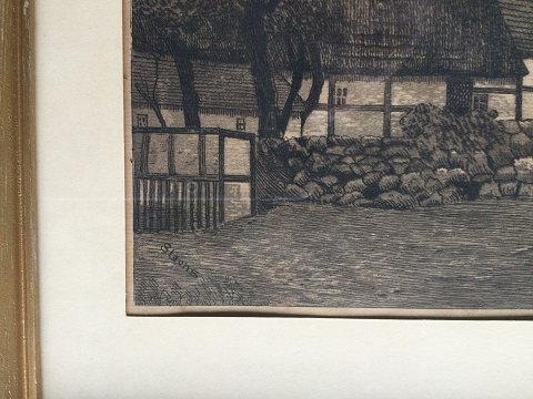 Axel Emil Jensen-Stevns (1879-1920): Gadeparti fra Gudhjem, Bornholm. Radering på papir. Signeret i trykket - Stevns. Små insekter bag glas. 17x24 (26x32)