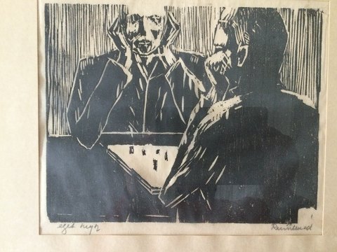Harald Reinhold (1911-96): Skakspillere. Træsnit på papir. Sign.: Reinhold Eget tryk. 25x30 (36x47) Harald Reinhold var udlært typograf, som maler autodidakt.