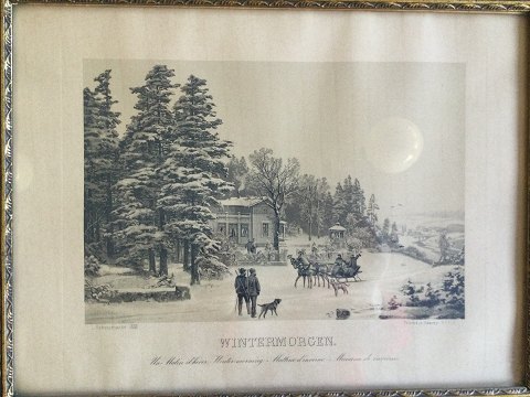Ubekendt kunstner (19/20 årh): "Wintermorgen" Litografi på papir. Printed in Saxony No 723. Indrammet i "vikinge" ramme 44x56
