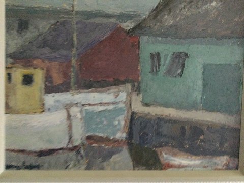 Parmo Baslund (født 1928): Havneparti Olie på plade, Sign.: Parmo Baslund 39x50 (44x55)
