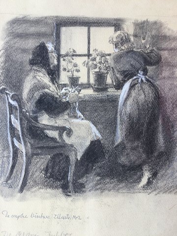 Axel Andreasen (1878-1953): 2 kvinder ved vindue. Illustration til "De Mørke Vinduer" Kridt og hvidt på papir. Sign.: A Betegnet Illustr. nr 2 - De Ældres Julebog. Indrammet 30x25