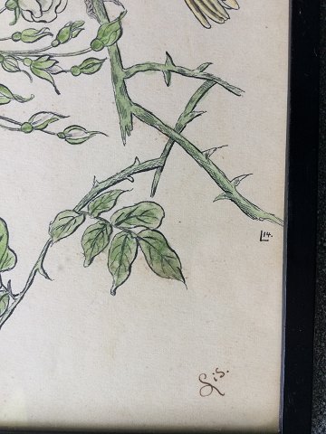Ubekendt kunstner (19/20 årh): Fugl på gren 1914. Farvelagt radering på papir. Sign.: L14 (i trykket) samt Lis (med blæk) Indrammet 29x20
