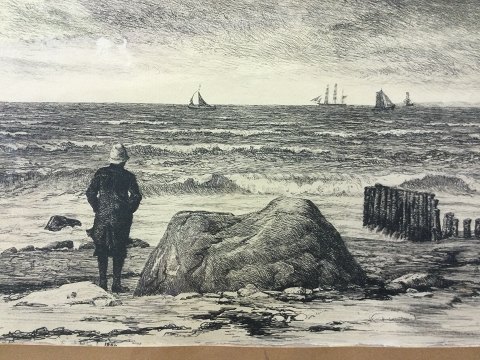 Carl Bloch (1834-90): Blæsevejr, søstykke 1884. Radering på papir. Sign.: Carl Bloch 1884 (i trykket)(næsten skjult af passepartout) 15x23 (28x35)