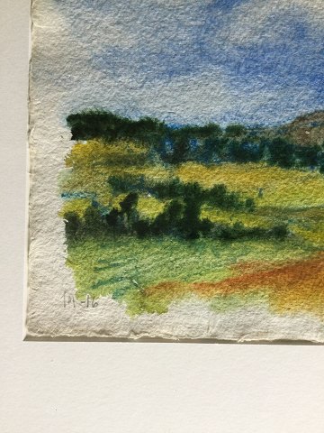 Jens Mathiesen (21 årh): Landskab 2016. Akvarel på håndgjort papir. Sign.: JM - 16. Galleri Salling. 25x27 (41x39)