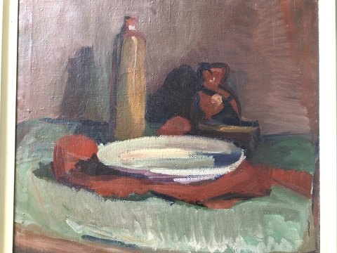 Opstilling med fad og krukker på bord.