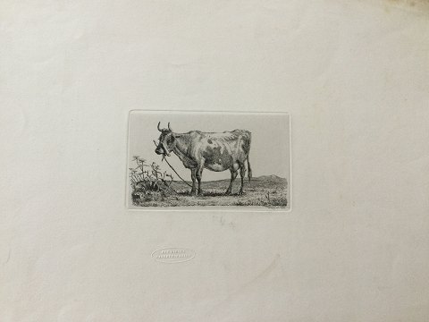 Johannes Vilhelm Zillen (1824-70): En ko på marken 1858 Radering på papir. Sign.: JV.Zillen 1858 DDRF 1875 Uden ramme. Bladet måler 27x36 (trykfladen 7x12) 27121