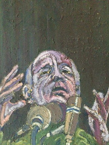 Torben Heron (1939-2019): Portræt af mand på talerstol med mikrofoner 1973. Olie på lærred. Sign.: Torben Heron 1973 (bagpå lærred) 58x49 (60x51)
