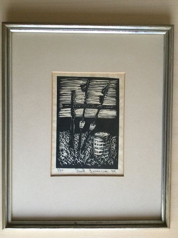 Poul Sørensen (1931-2018): Bøjer mv i havnen 1974. Linoleumssnit på papir. Sign.: Poul Sørensen 74 (bly) Nummer 1/80 15x11 (29x25) Poul Sørensen er uddannet fra Teknisk Skole i Frederikshavn.
