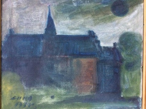 Svend Aage Tauscher (1911-82): Byparti med kirke 1975. Bagpå betegnet "Justorum Animae Dei" Anno 1975. Frit oversat "Guds retfærdige sjæl" Olie på lærred. Sign.: SAAT 1975. 46x55 (51x61)