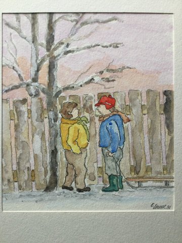 Erik Stuhr (1936-2014): 2 drenge med kælk i samtale 1991 Akvarel på papir monteret på passepartout. Sign.: E. Stuhr 91 Uden ramme. 16x14 (men passepartout 30x21)