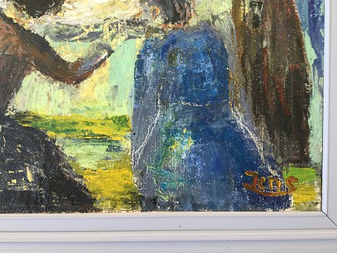 Jens Nielsen (1891-1978): Lazarus' opvækkelse 1945. Sign.: Jens Olie på lærred. Bagpå stempel 10/1 1945, Stockholm 19/1 1946 samt Udstilling i Kunstnernes Hus i Oslo 1957 nr. 25. 71x85 (87x101)