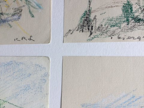 Ubekendt kunstner (20 årh): 4 bjerglandskaber i samme ramme. Oliekridt på papir. Indrammet i samme ramme uden glas. Betegnet "I Bjergene" nr. I, II, III og IV. Sign.: ICRL Indrammet 46x61 49121