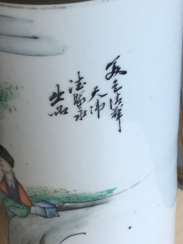 Polykromt dekoreret med skrifts tegn og scene med personer.