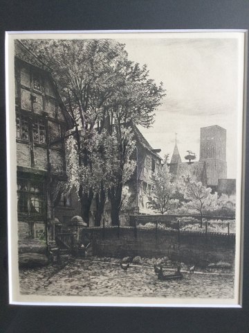 Peter Tom-Petersen (1861-1926): Apotekets Gård i Ribe 1903 Radering på papir. Sign.: Monogram 1903 Indrammet med nyt syrefrit passepartout. 19½x23 (40x36) 46521