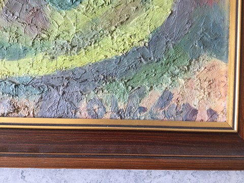 Opstilling med blomsterbuket og frugtfad på bord 1950.