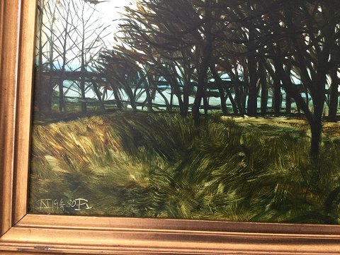 Nils Ryberg (født 1946): Æbleplantage 1980. Olie på masonitplade. Sign.: N19 6/1 80R. Bagpå plade - Nils Ryberg 80 - Æbleplantage. Indrammet i ældre ramme med afslag. 27x39 (39x51) 30622