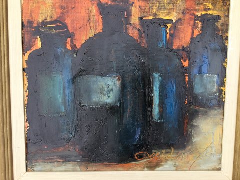 Adelbert Winther Venø (1913-72): Opstilling med flasker. Olie på lærred. Sign.: A.W. Venø. 35x40 (54x59) A. Venø var uddannet i Holland hos maleren van Hoff.