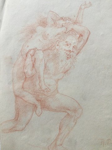Robert Büchtger (1862-1951): Nøgen ung kvinde på skulderen af nøgen gammel mand. Rødkridt på papir. Sign.: R.B. Uden ramme. Bladet måler 22 x 16½ 32322
